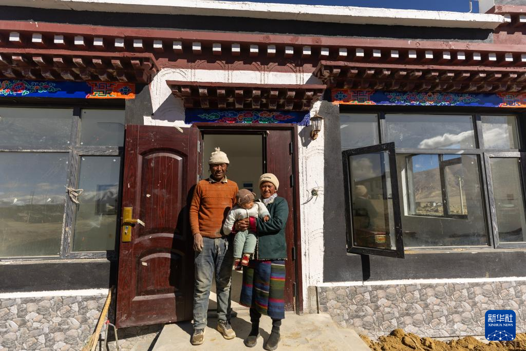 2025年10月24日,在西藏定日縣長所鄉(xiāng)雜村,外公米瑪(左)、母親朋瓊和次仁拉巴在已交付的新房前合影。新華社記者 姜帆 攝