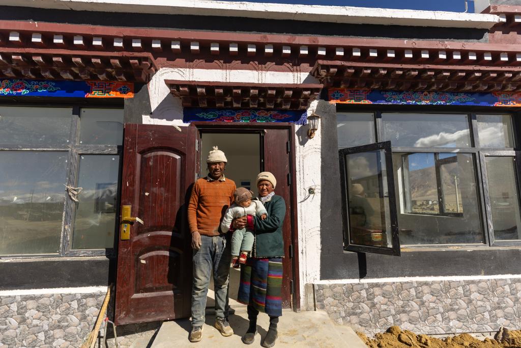 2025年10月24日,在西藏定日縣長(zhǎng)所鄉(xiāng)雜村,外公米瑪(左)、母親朋瓊和次仁拉巴在已交付的新房前合影。新華社記者 姜帆 攝