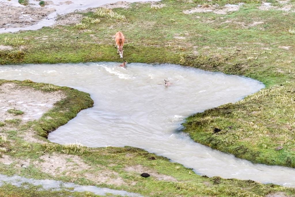 森隆藏布河最窄處僅有一米寬,但水流湍急,剛出生不久的藏羚羊幼崽過河前,需母羊反復(fù)測(cè)試路線,引導(dǎo)幼崽在合適的位置跳躍或趟水渡河。