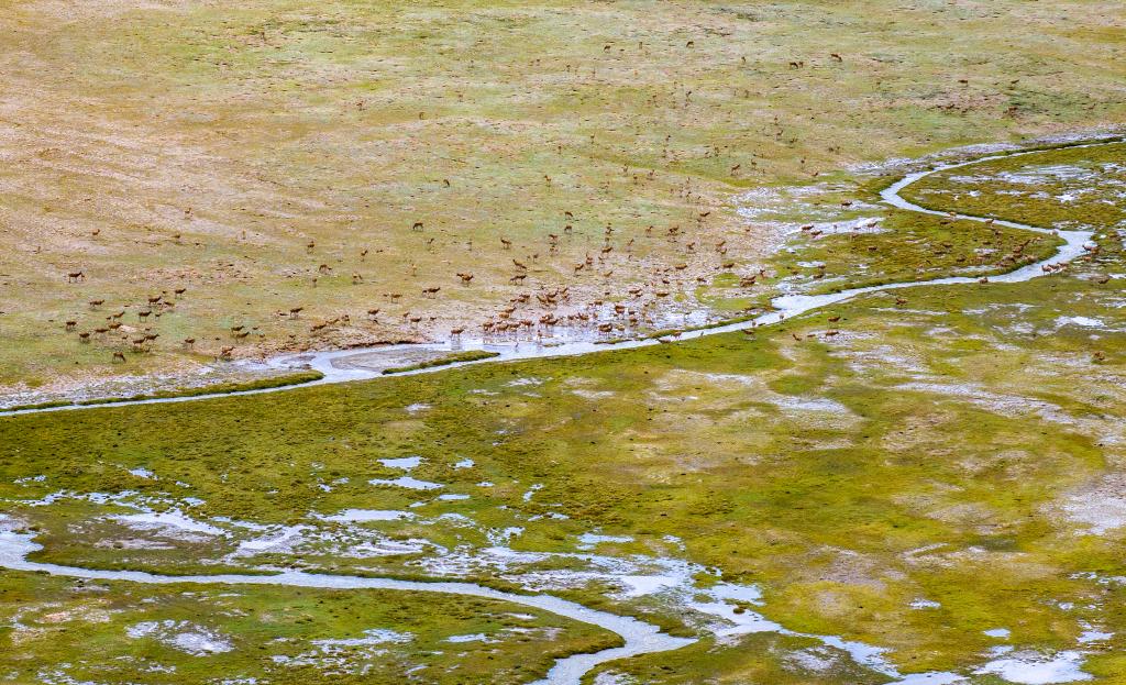 一群帶著幼崽的藏羚羊渡過森隆藏布河(2025年7月15日攝)。