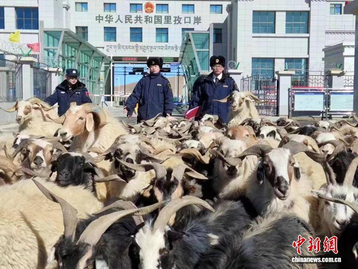 圖為拉薩海關(guān)關(guān)員監(jiān)管驗(yàn)放出口活羊。拉薩海關(guān) 供圖
