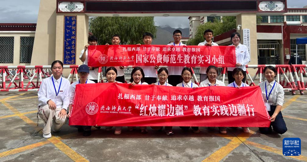 2025年8月23日,陜西師范大學(xué)國家公費師范生教育實習(xí)小組部分成員在拉薩阿里地區(qū)高級中學(xué)合影。(受訪者供圖)