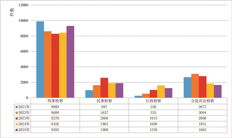 2021年—2025年全區(qū)檢察機(jī)關(guān)“四大檢察”業(yè)務(wù)趨勢(shì)變化圖