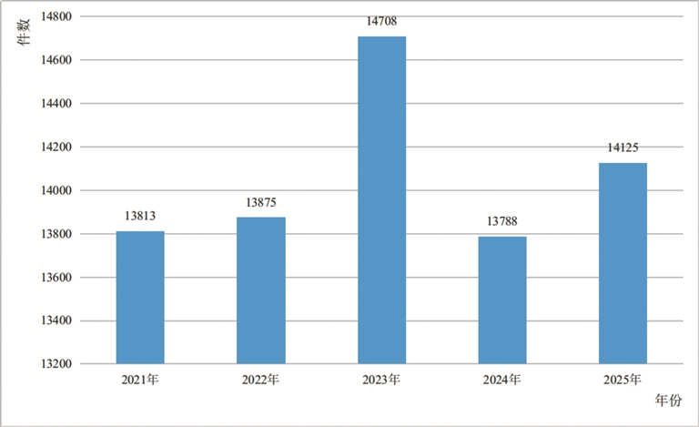 2021年—2025年全區(qū)檢察機(jī)關(guān)辦案總量變化趨勢(shì)圖