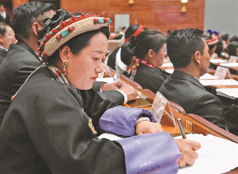 人大代表們?cè)谡J(rèn)真聽會(huì)。記者 洛桑 攝
