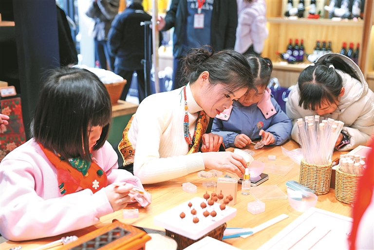 在“藏文化體驗區(qū)”,藏香咨詢師劉曉靜(中)在指導孩子們制作藏香手串。本報記者 周婷婷 攝