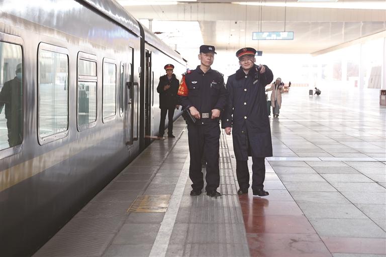 列車出發(fā)前,左紅彬(左)在站臺(tái)進(jìn)行安全檢查。通訊員 黃飛 攝