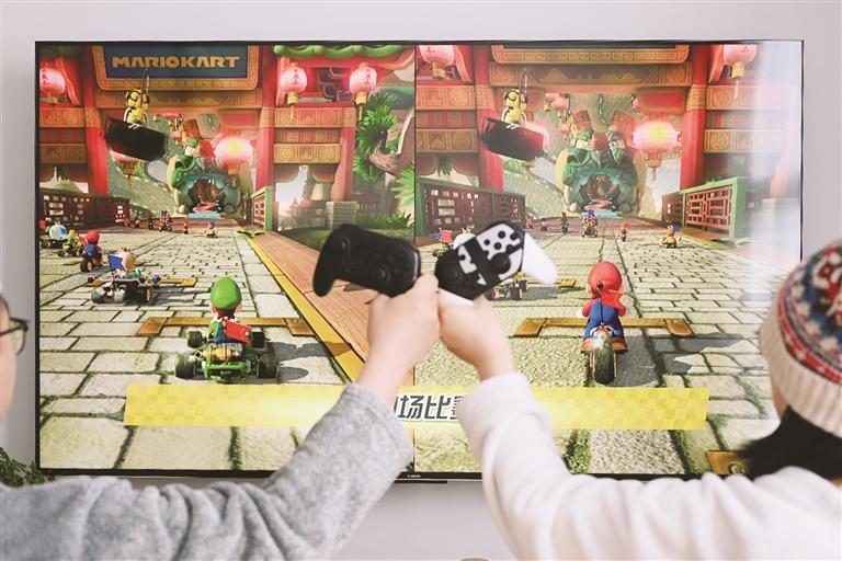 拉薩市民在家中體驗(yàn)任天堂經(jīng)典游戲《馬里奧賽車》。