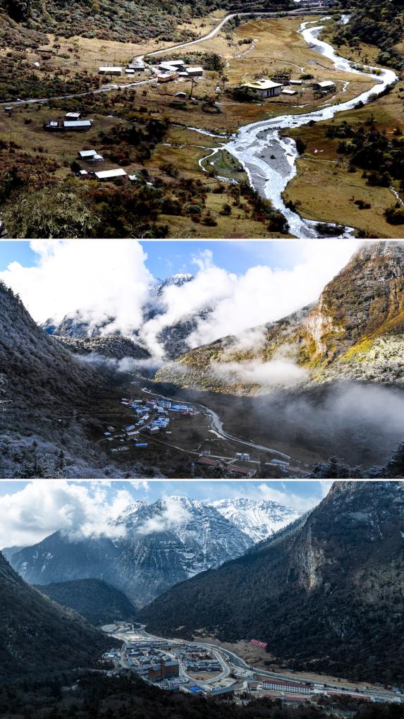 拼版照片:上圖是2003年10月26日拍攝的玉麥鄉(xiāng)(新華社記者索朗羅布攝);中圖是2017年10月31日拍攝的玉麥鄉(xiāng)(新華社記者普布扎西攝);下圖是2026年2月5日拍攝的玉麥鄉(xiāng)(無人機(jī)照片,新華社記者丁增尼達(dá)攝)。