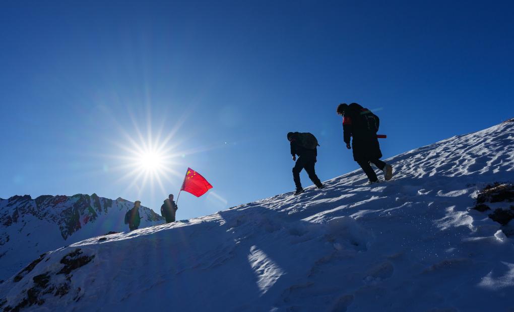 在西藏山南市隆子縣玉麥鄉(xiāng)境內(nèi),護(hù)邊員們在雪坡上巡邏(2月6日攝)。新華社記者 丁增尼達(dá) 攝