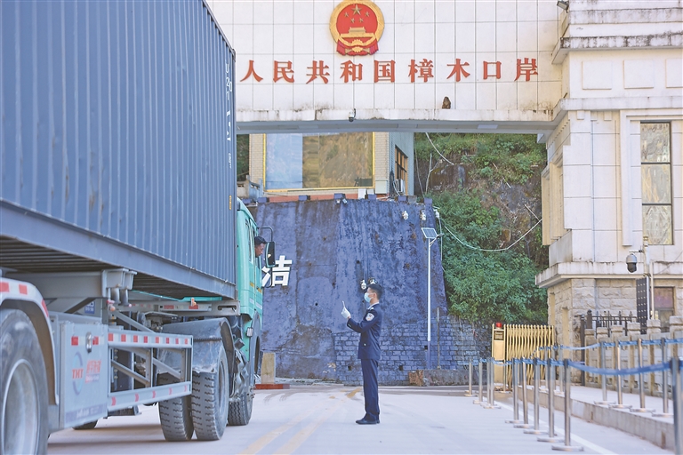 上午10時(shí),車輛通道漸忙。尼泊爾貨車司機(jī)Sandiki緩緩駛近查驗(yàn)點(diǎn),執(zhí)勤民警上前核驗(yàn)證件、檢查車體,流程嫻熟規(guī)范。