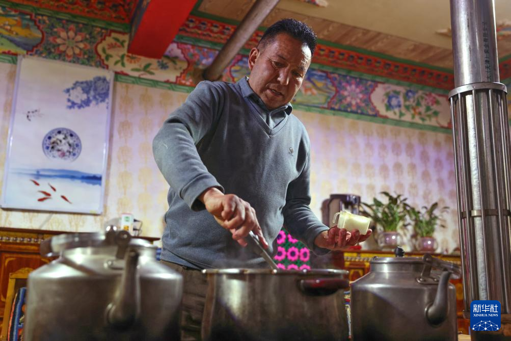 2月16日,在拉薩堆龍德慶區(qū)東嘎街道桑木社區(qū),群群在攪拌“古突”。新華社記者 丁增尼達(dá) 攝