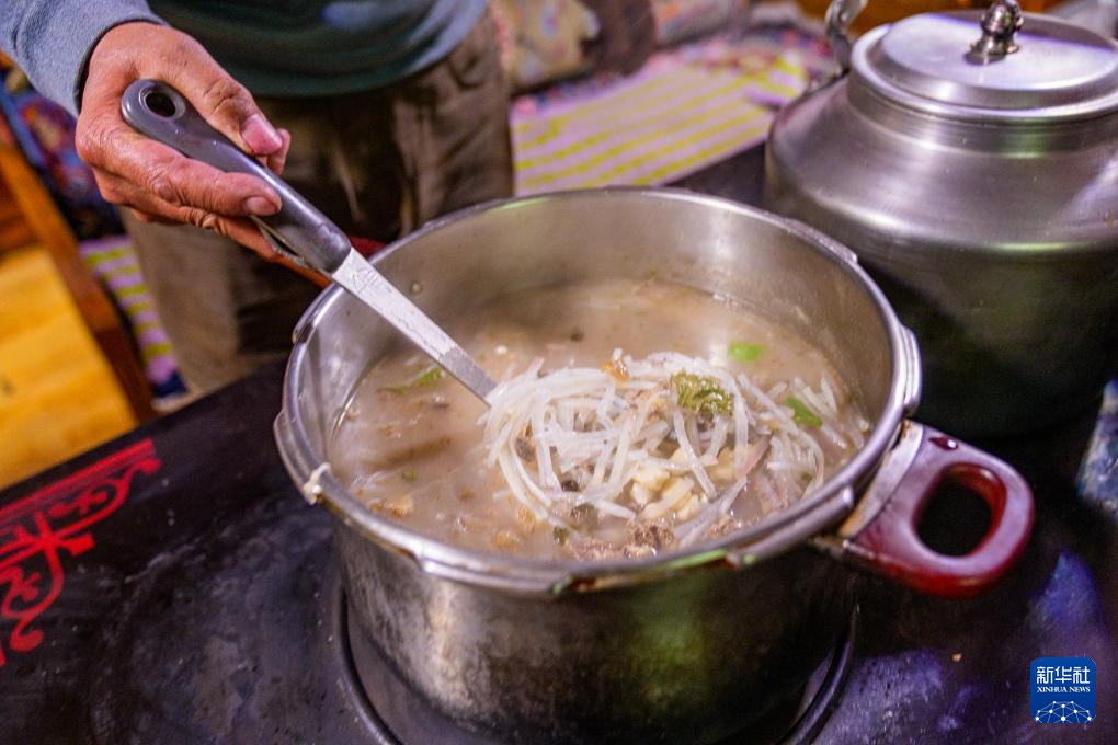 2月16日,在拉薩堆龍德慶區(qū)東嘎街道桑木社區(qū),群群的妻子扎桑(左)在為家人盛“古突”。新華社記者 丁增尼達(dá) 攝