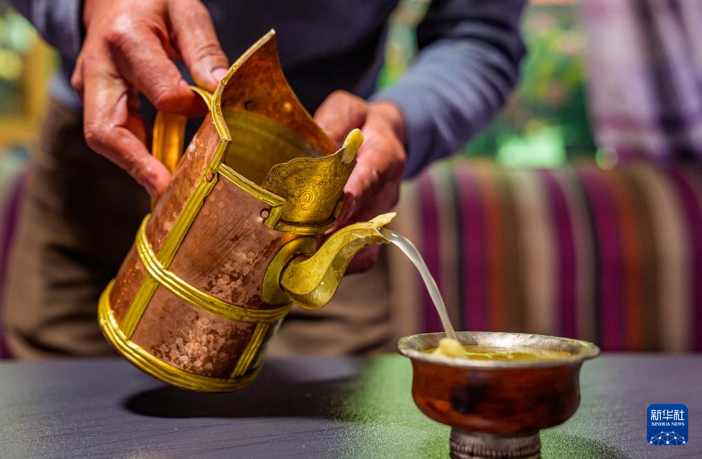 2月16日,在拉薩堆龍德慶區(qū)東嘎街道桑木社區(qū),群群在倒青稞酒。新華社記者 丁增尼達(dá) 攝