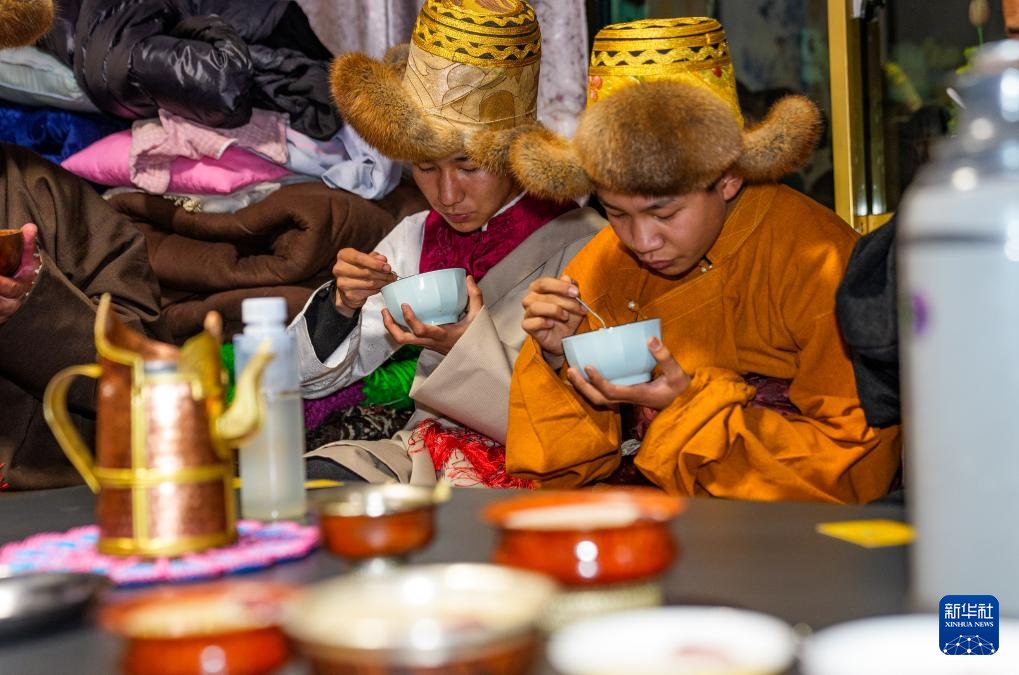 2月16日,在拉薩堆龍德慶區(qū)東嘎街道桑木社區(qū),群群一家人在吃“古突”。新華社記者 丁增尼達(dá) 攝