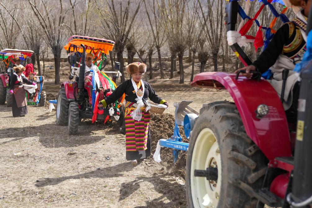 3月16日,山南市結(jié)巴鄉(xiāng)結(jié)巴村村民為拖拉機(jī)手和播撒種子的婦女獻(xiàn)上哈達(dá)。新華社記者晉美多吉 攝