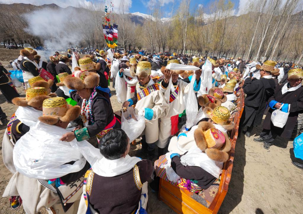 62歲的村民桑吉頭頂黑色禮帽,身著氆氌藏裝,跟鄉(xiāng)親們聊著天。他說,盡管外出務(wù)工的收入比務(wù)農(nóng)高,但春耕儀式當(dāng)天,年輕人都會(huì)趕回村里參加,祈愿風(fēng)調(diào)雨順、五谷豐登。