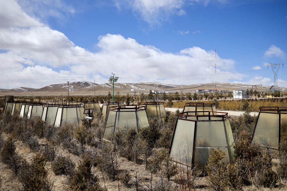 西藏那曲地區(qū)城鎮(zhèn)植樹(shù)關(guān)鍵技術(shù)研發(fā)與綠化模式示范項(xiàng)目示范基地中的頂開(kāi)式濾光溫室。新華社記者 周昱龍 攝