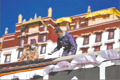 布達(dá)拉宮管理處維修科工作人員在粉刷墻體。新華社記者 晉美多吉攝