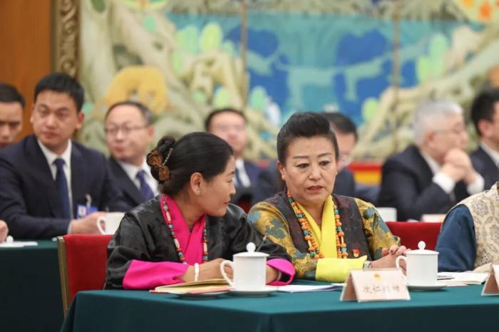 3月6日,十四屆全國(guó)人大四次會(huì)議西藏代表團(tuán)舉行開放團(tuán)組會(huì)議。圖為會(huì)前,全國(guó)人大代表次仁措姆(左)和格桑卓瑪交流。