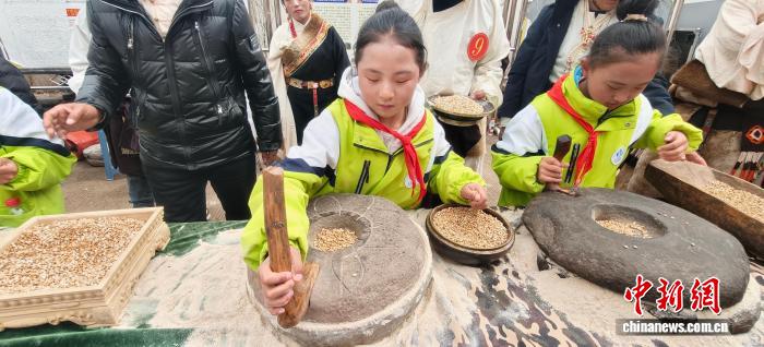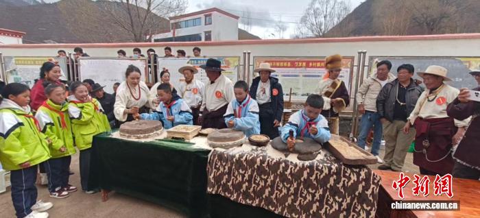 圖為俄洛鎮(zhèn)賽事活動中組織學(xué)生體驗(yàn)傳統(tǒng)磨糌粑技能??ㄈ魠^(qū)融媒體中心 供圖