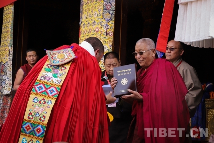 圖為佛協(xié)西藏分會(huì)副會(huì)長(zhǎng)、扎什倫布寺堪布噶欽 多吉堅(jiān)贊向獲得學(xué)位的考僧獻(xiàn)哈達(dá)并頒發(fā)學(xué)位證書 攝影:賈華加
