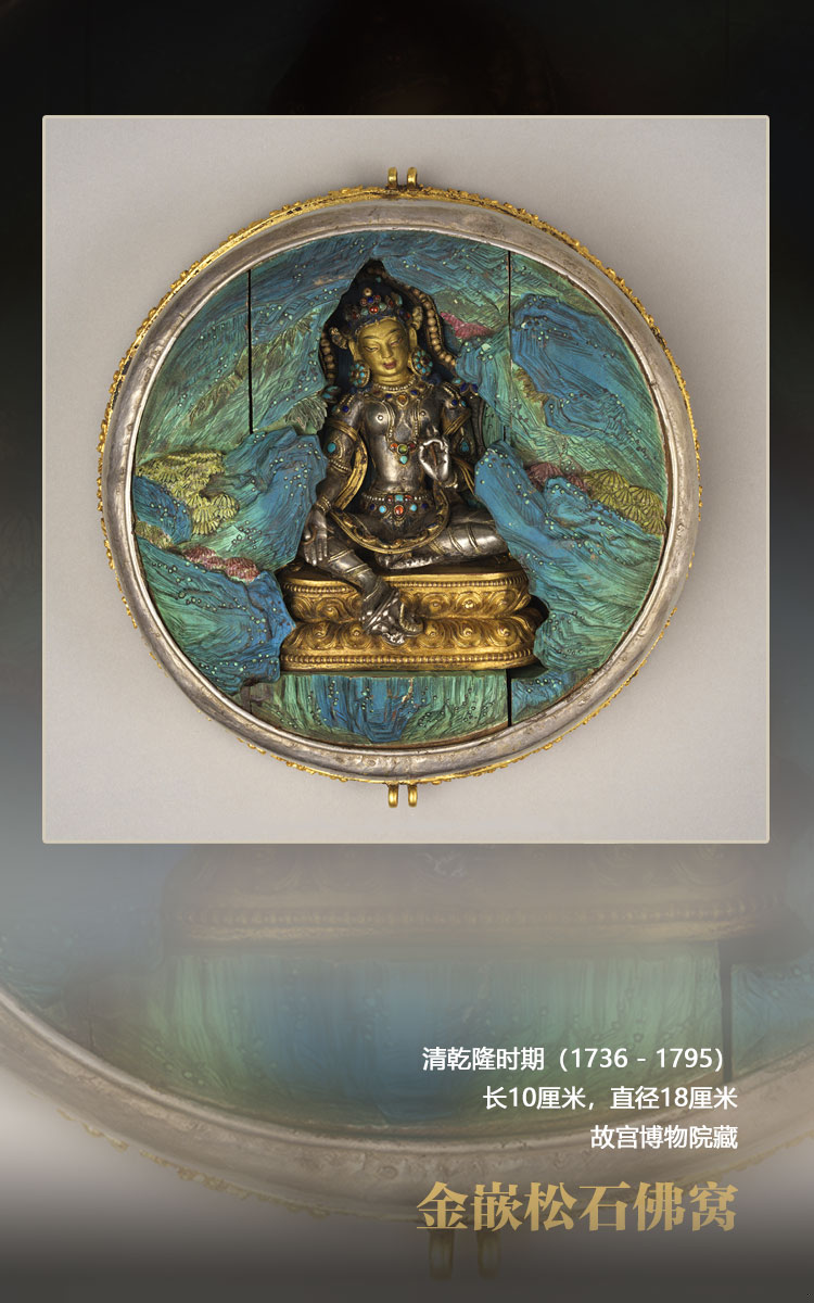 此佛窩九成金質(zhì),圓盒狀,金質(zhì)盒蓋上滿嵌梯形同心圓狀綠松石片,側(cè)面有三條松石鑲嵌的裝飾帶及蓮花紋圖案。盒蓋兩邊有可拆卸雙耳,可穿繩佩戴頸上,為護(hù)身佛盒。盒內(nèi)填染青綠木雕山洞,中間供有銀質(zhì)綠度母一尊。度母面部泥金,右手與愿印,左手說法印,身上嵌綠松石、青金石、蜜蠟等,游戲坐于飾連珠紋和俯仰蓮瓣紋的金座上。附黃紙簽一張,上書漢、滿、蒙、藏四體文題記,漢文曰:“乾隆四十五年八月初七日,班禪額爾德尼恭?;噬掀哐f壽,遞丹書,呈進(jìn)大利益綠衣救度佛母古佛?!?此處“大利益”有大功德之意,根據(jù)銘文可知,這個佛窩應(yīng)是乾隆帝七十大壽時六世班禪敬獻(xiàn)的祝壽禮物。(文圖資料來源:澳門藝術(shù)博物館 中國西藏網(wǎng) 記者/易文文 趙佳 呂靜 王東 姚浩然)