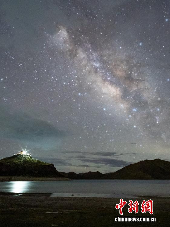 西藏山南羊卓雍錯日托寺,因為海拔高、遠離城市光污染,是理想的觀星之地。近日,海拔4400多米的寺廟夜空清澈,銀河清晰可見,璀璨星辰與羊卓雍錯相映成趣,吸引游客和攝影愛好者觀星拍攝。圖為日托寺(燈光處)上空銀河璀璨。江飛波 攝