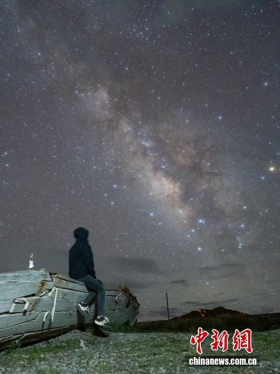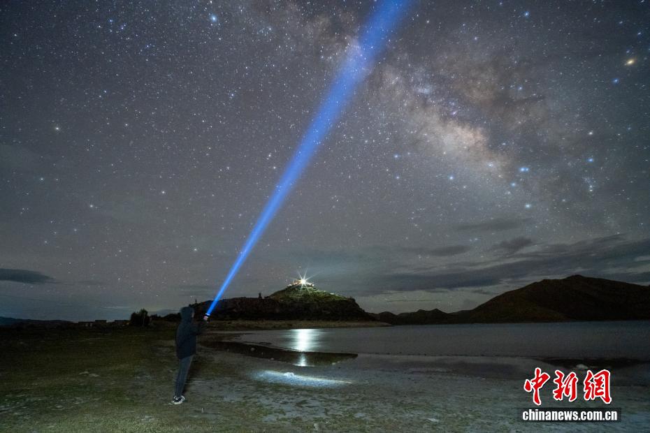 西藏山南羊卓雍錯日托寺,因為海拔高、遠離城市光污染,是理想的觀星之地。近日,海拔4400多米的寺廟夜空清澈,銀河清晰可見,璀璨星辰與羊卓雍錯相映成趣,吸引游客和攝影愛好者觀星拍攝。圖為游客在羊卓雍錯日托寺附近與銀河“打卡”。江飛波 攝