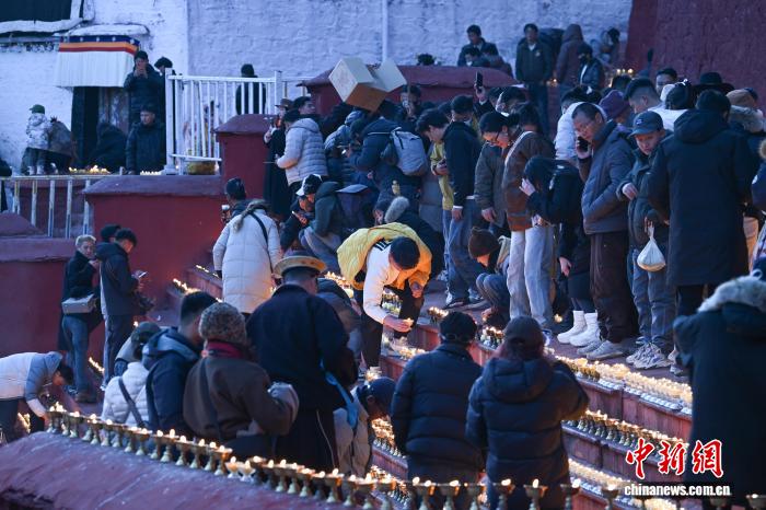 12月14日即藏歷十月二十五日,是藏傳佛教格魯派燃燈日。在西藏拉薩市的藏傳佛教格魯派祖寺甘丹寺內(nèi),信眾點(diǎn)燃酥油燈,祈福平安吉祥。“燃燈日”是紀(jì)念藏傳佛教格魯派創(chuàng)始人宗喀巴大師圓寂而舉行的活動,已有600多年歷史。圖為信眾在甘丹寺內(nèi)點(diǎn)酥油燈。 中新社記者 貢嘎來松 攝