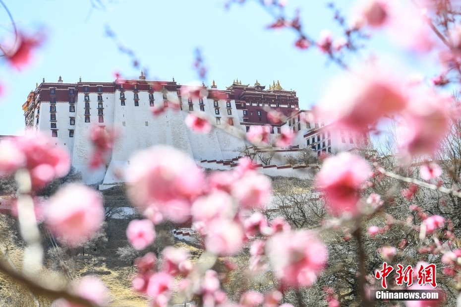 3月15日,杏花映襯下的布達拉宮。新華網 旦增努布 攝