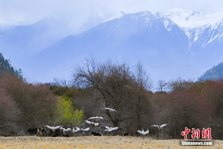 3月30日,在西藏林芝市巴宜區(qū)更章門巴民族鄉(xiāng),黑頸鶴與周邊的村莊、桃花、雪山融為一體,成為春日里的一道靚麗的風(fēng)景線。圖為黑頸鶴在田間覓食嬉戲。