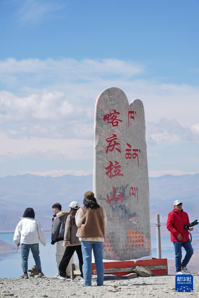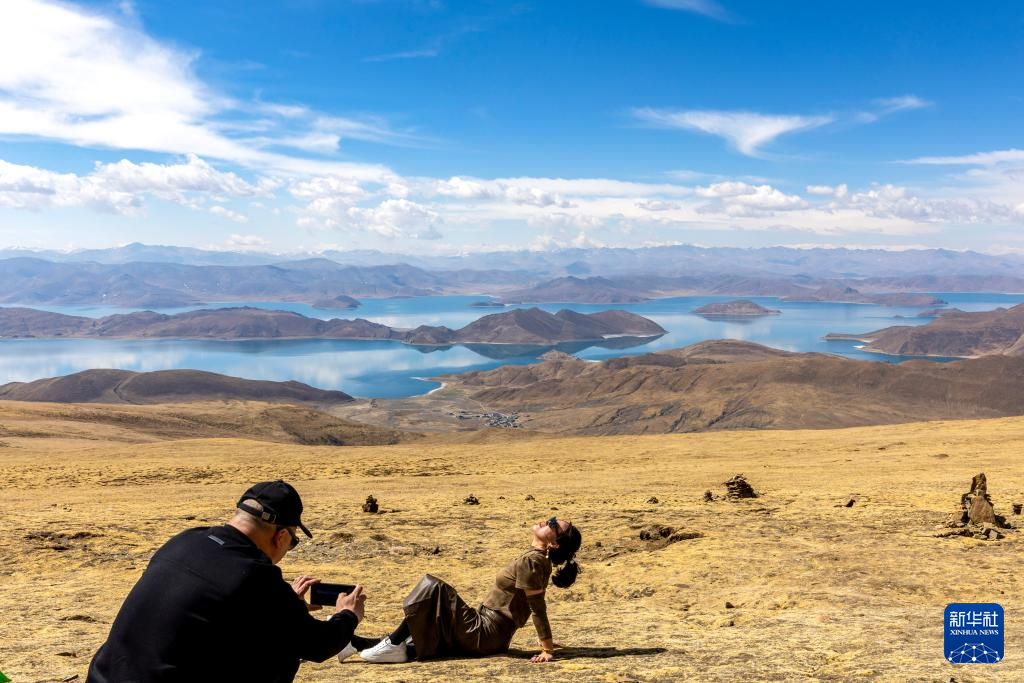 游客在喀慶拉山上以羊卓雍錯為背景拍照(4月5日攝)。新華社記者 姜帆 攝