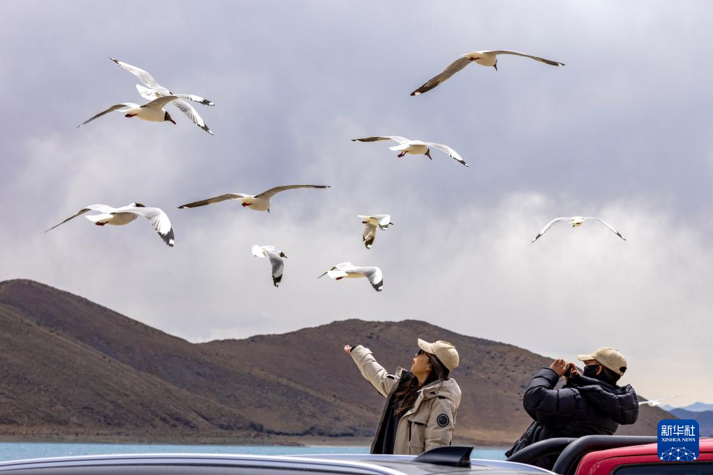 游客在羊卓雍錯北岸的日托寺附近投喂棕頭鷗(4月5日攝)。新華社記者 張汝鋒 攝