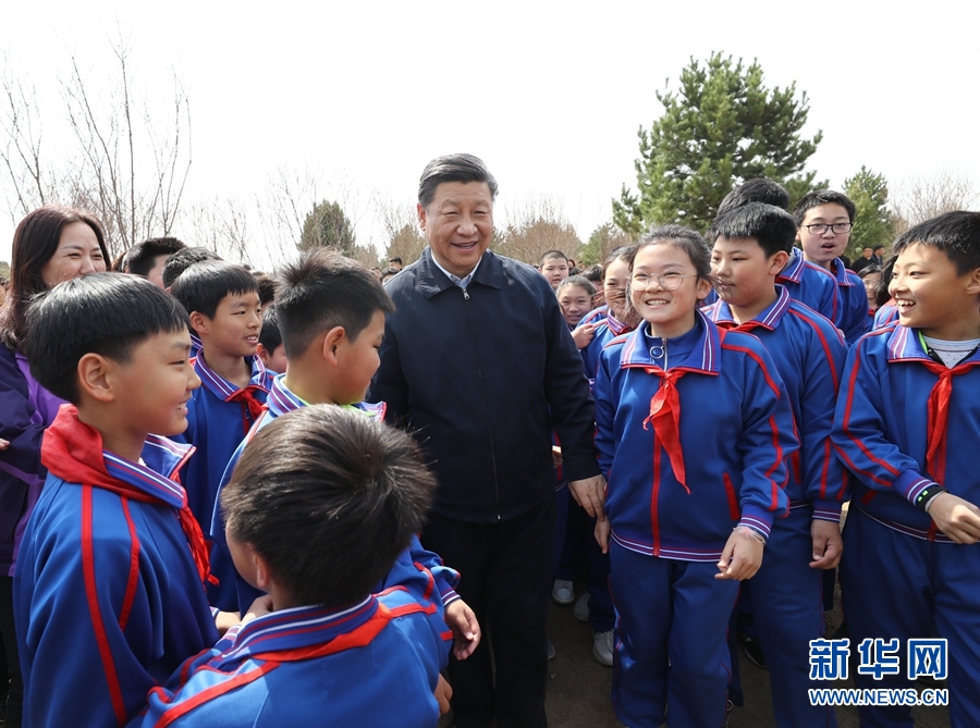 4月8日,黨和國家領(lǐng)導(dǎo)人習(xí)近平、栗戰(zhàn)書、汪洋、王滬寧、趙樂際、韓正、王岐山等來到北京市通州區(qū)永順鎮(zhèn)參加首都義務(wù)植樹活動。這是習(xí)近平同少先隊員在一起。新華社記者鞠鵬 攝