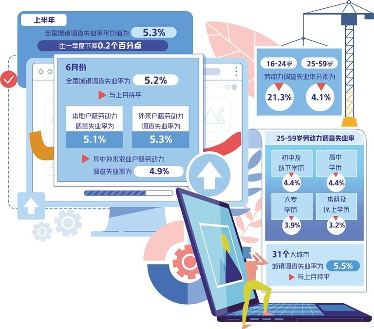 就業(yè)是最大的民生,也是經(jīng)濟(jì)的基本支撐。國(guó)家統(tǒng)計(jì)局最新數(shù)據(jù)顯示,上半年,全國(guó)城鎮(zhèn)調(diào)查失業(yè)率平均為5.3%,比一季度下降0.2個(gè)百分點(diǎn),就業(yè)形勢(shì)總體穩(wěn)定。[詳細(xì)] -