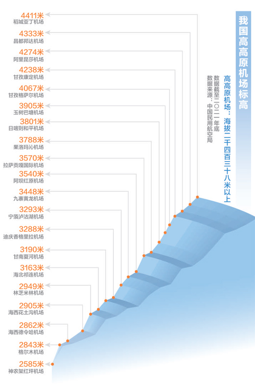 機(jī)場(chǎng)標(biāo)高在1524米至2438米的機(jī)場(chǎng)稱為“高原機(jī)場(chǎng)”。而“高高原機(jī)場(chǎng)”,指海拔高度2438米以上的機(jī)場(chǎng),所在地區(qū)地形復(fù)雜、氣候惡劣、空氣稀薄,對(duì)機(jī)場(chǎng)建設(shè)、航空器運(yùn)維和人員素質(zhì)都提出了更高要求。截至2021年底,我國(guó)共有已投運(yùn)高高原機(jī)場(chǎng)20個(gè),其中稻城亞丁機(jī)場(chǎng)海拔4411米,為世界海拔最高的機(jī)場(chǎng)。高高原機(jī)場(chǎng)不僅為當(dāng)?shù)貛ト藲?,推?dòng)經(jīng)濟(jì)社會(huì)發(fā)展,還顯著改善中西部地區(qū)交通條件,為建設(shè)交通強(qiáng)國(guó)發(fā)揮重要作用。