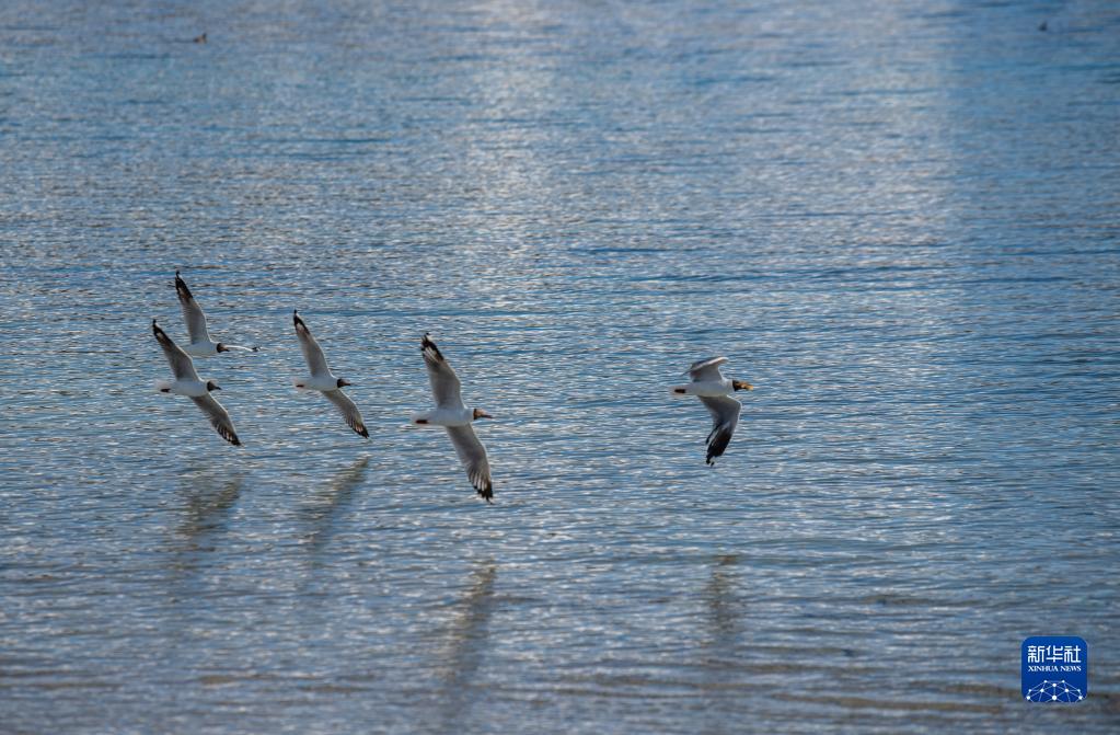 水鳥在羊卓雍錯湖面滑翔(7月2日攝)。新華社記者 孫非 攝