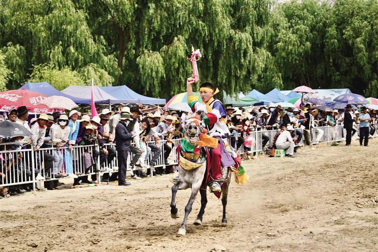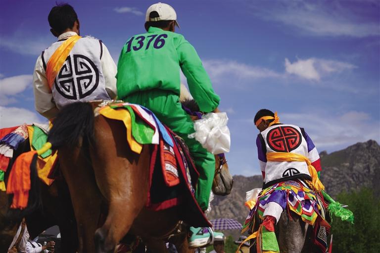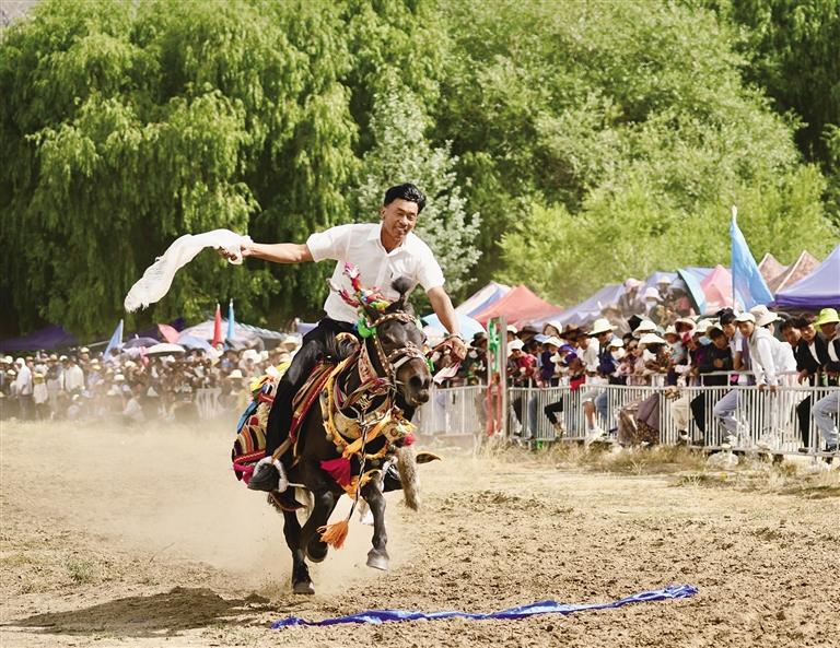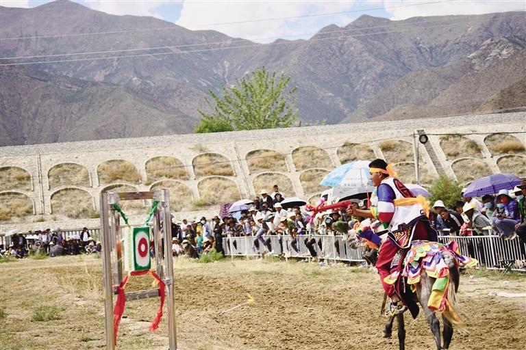 當日上午11時,茶巴朗村望果節(jié)賽馬正式開始,騎手們身著傳統(tǒng)服飾,戴著紅纓帽,身背彎弓,騎著打扮華麗的駿馬,進行了4000米速度賽馬、拾哈達、射箭、馬術等精彩比賽?,F(xiàn)場,觀眾揮舞手臂為選手們鼓勁吶喊。馳騁在賽場上,選手的吆喝聲伴著觀眾的吶喊聲在賽場上空匯聚。