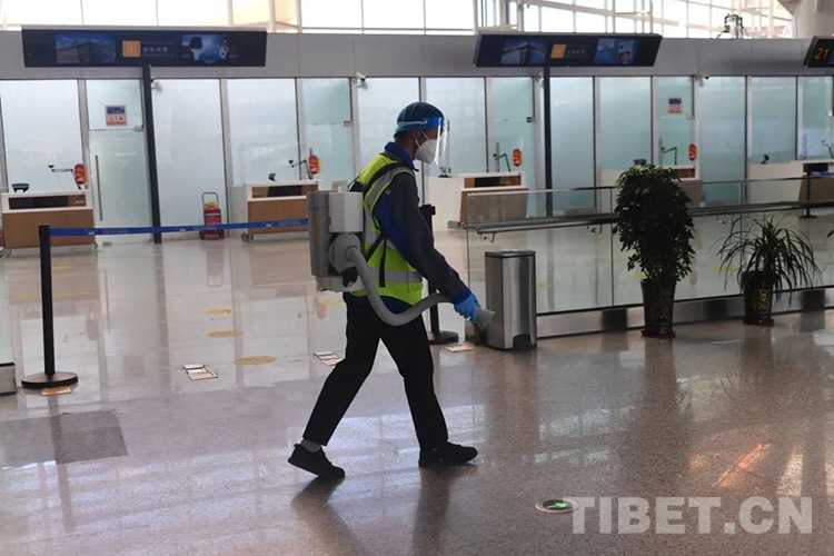 圖為拉薩貢嘎機(jī)場工作人員正在消毒 圖片由民航西藏自治區(qū)管理局提供