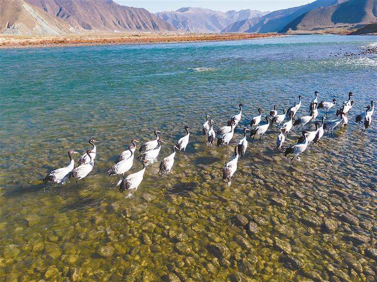 隨著西藏不斷加大黑頸鶴棲息地保護(hù)力度,黑頸鶴的生存環(huán)境進(jìn)一步改善。每年十月中下旬,大批“高原精靈”——黑頸鶴從藏北高原飛到拉薩河谷,它們在農(nóng)田、沼澤地里覓食嬉戲,享受冬日暖陽?!?/p>