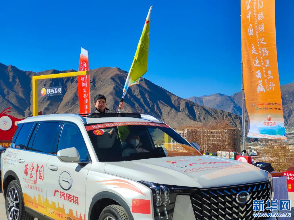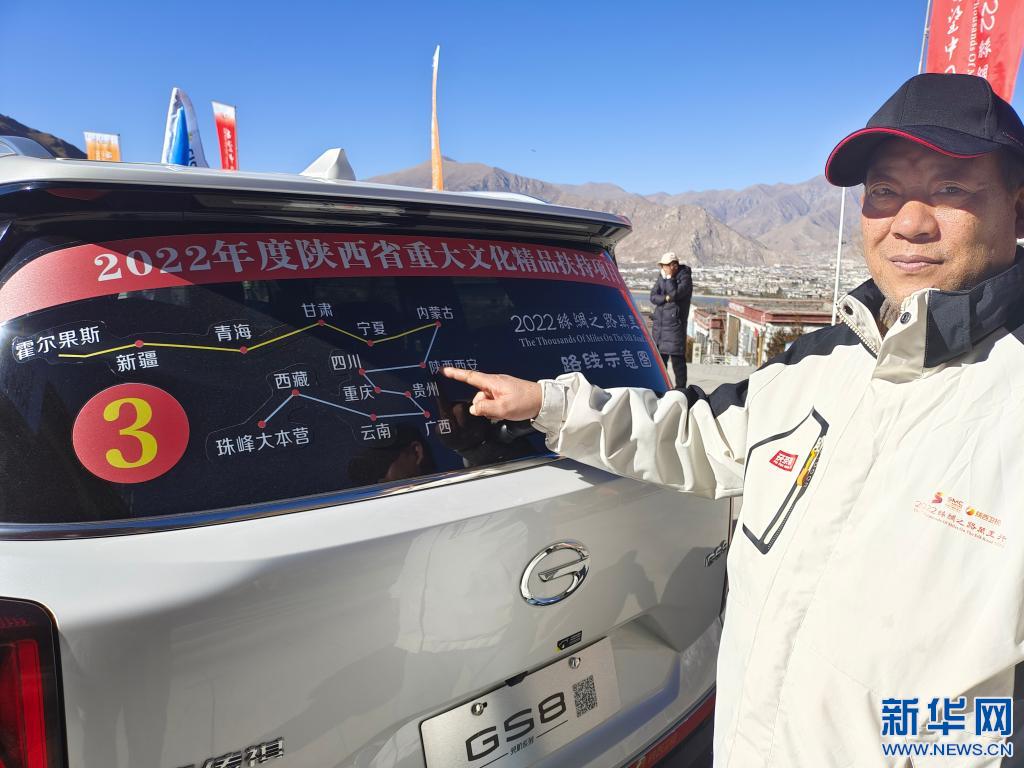 在拉薩市文成公主實(shí)景劇場(chǎng)前的廣場(chǎng)上,一列車(chē)隊(duì)緩緩駛過(guò)。有人從天窗探出身子揮舞著旗幟,旗上寫(xiě)著:“2022絲綢之路萬(wàn)里行,西望中國(guó)”。