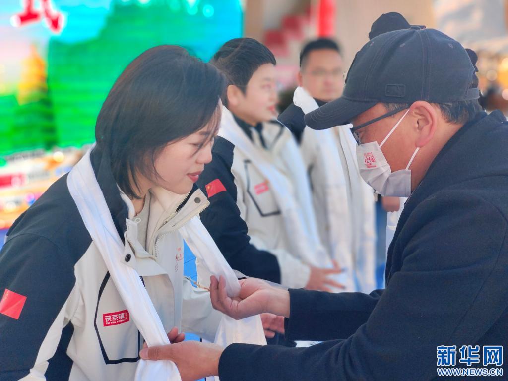 抵達(dá)終點(diǎn)后,車(chē)隊(duì)成員接受哈達(dá)(12月23日攝)。記者劉洲鵬 攝
