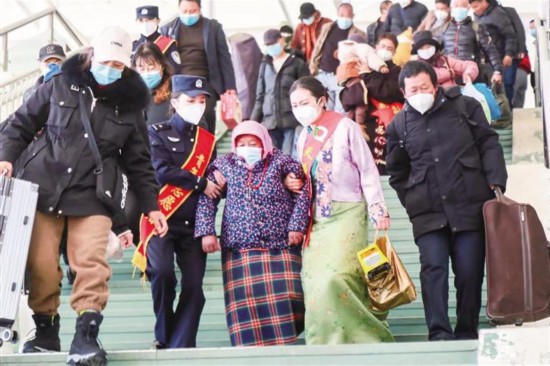 鐵路公安處民警和志愿者護送老人上車。 圖由鐵路公安處提供