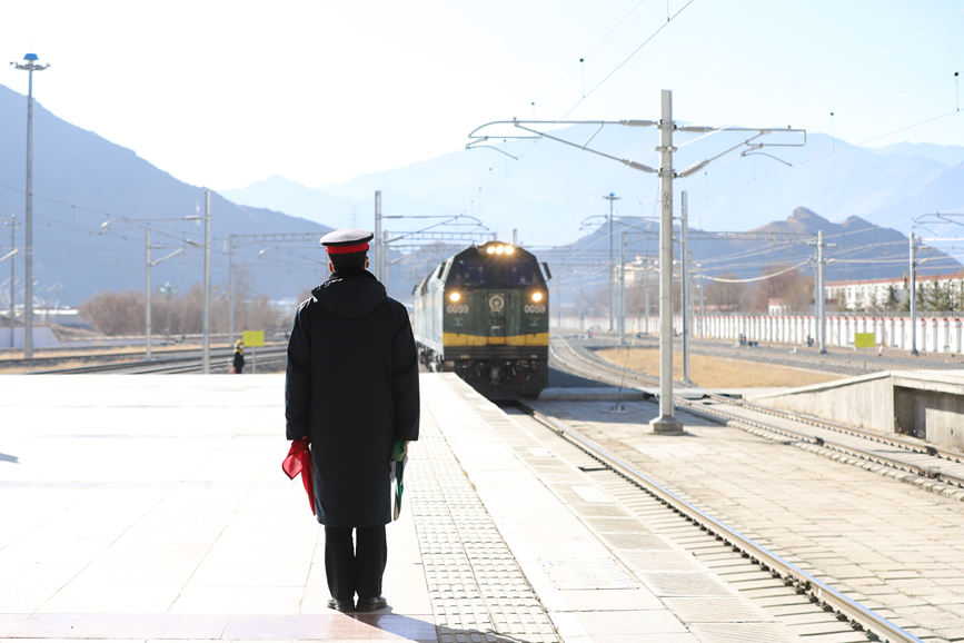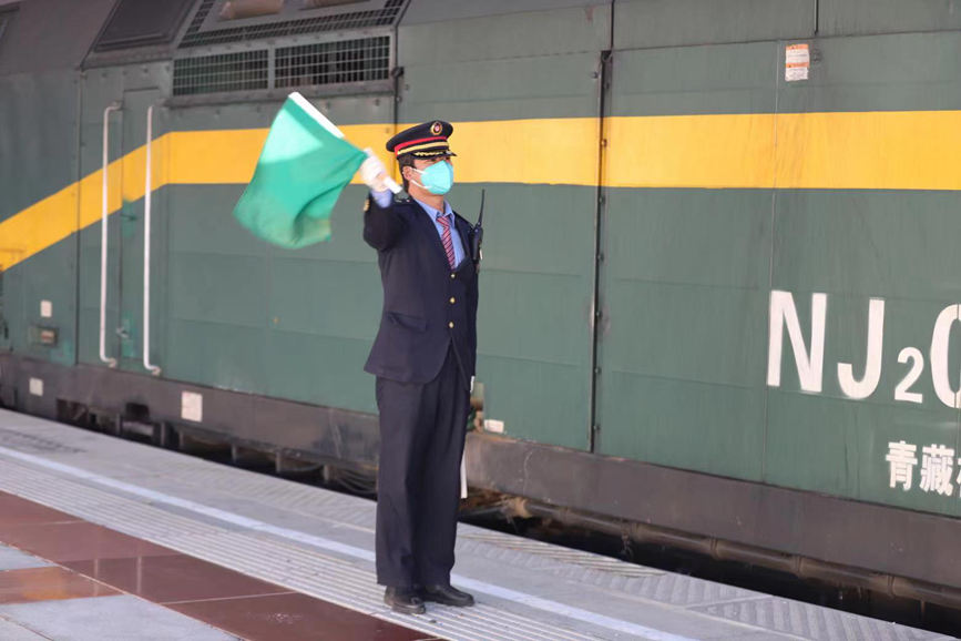 伴隨著一圈一圈揮動的信號旗,列車緩緩駛出拉薩站。目送著列車安全、準時地駛離后,全海文收攏信號旗又大步向站臺另一端走去。