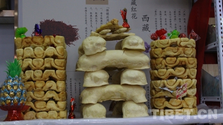 圖為年貨市場里擺放的“德嘎”樣式(是由形狀不同的油炸面食壘起來的供品) 攝影:次旦拉姆