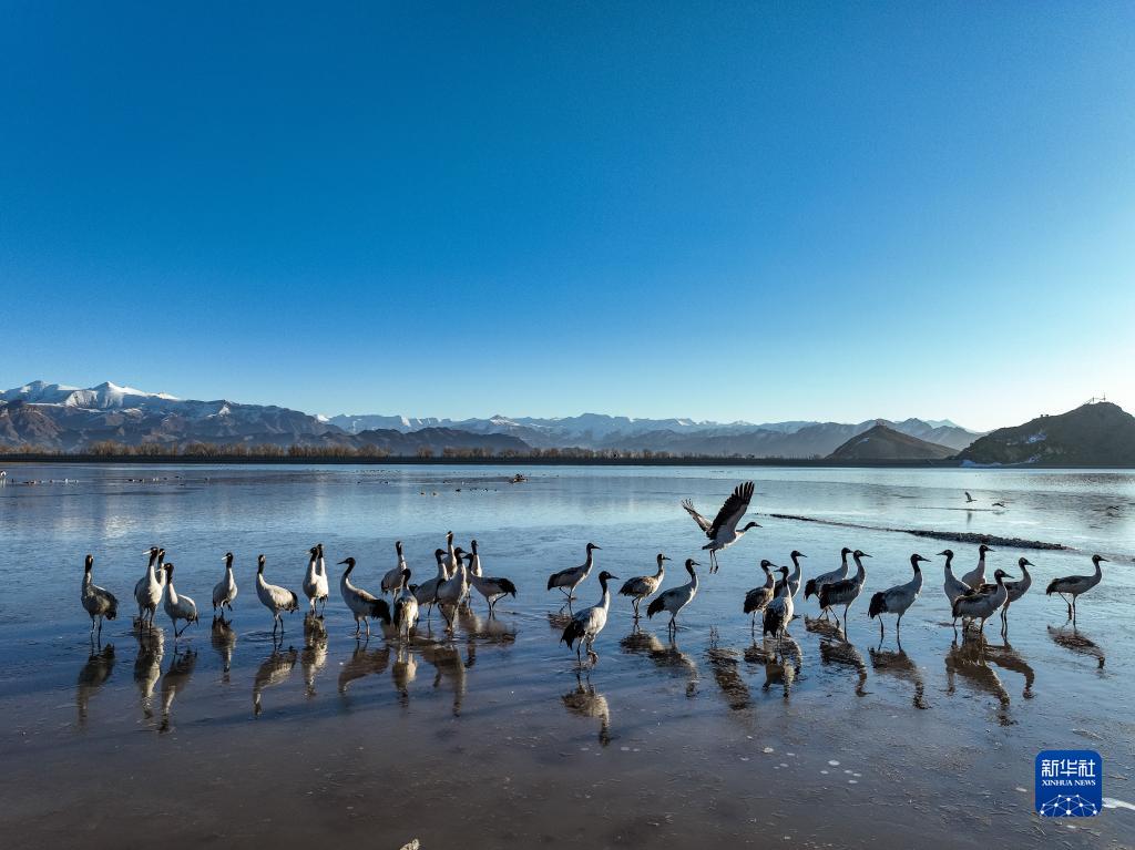 這是在拉薩市林周縣虎頭山水庫(kù)拍攝的黑頸鶴(3月1日攝)。新華社記者 張汝鋒 攝