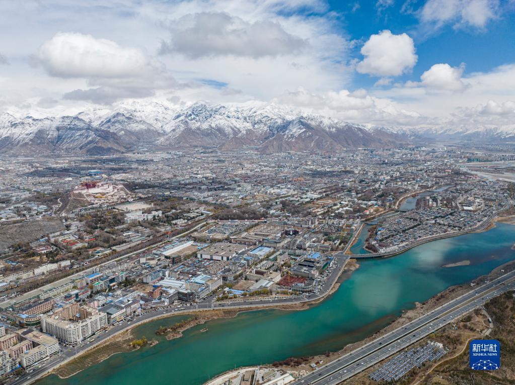 空中俯瞰拉薩雪景(3月30日攝,無人機照片)。新華社記者 孫非 攝