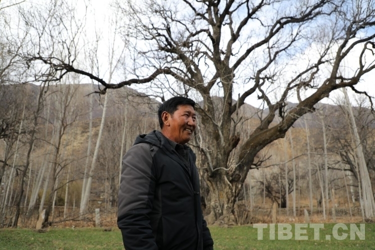 圖為熱果村黨支部書(shū)記達(dá)娃與身后的“糌粑拉姆”核桃樹(shù) 攝影:呂靜