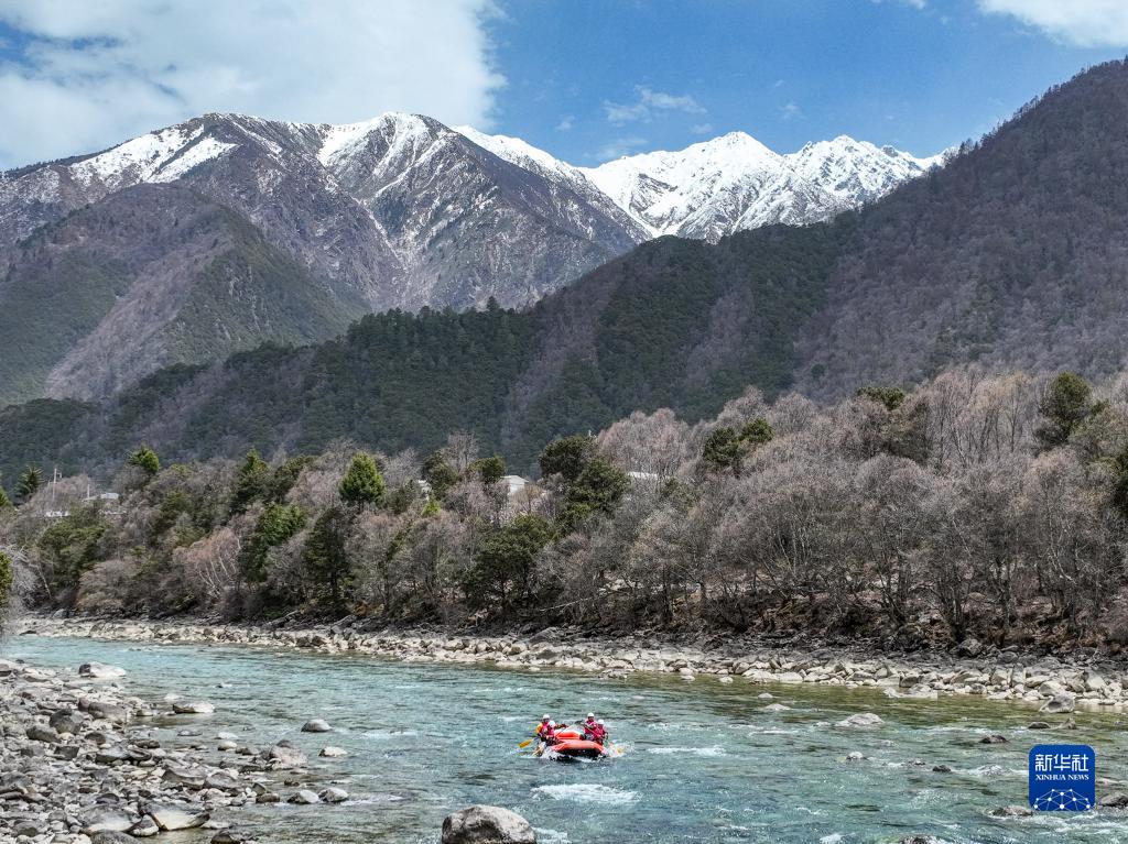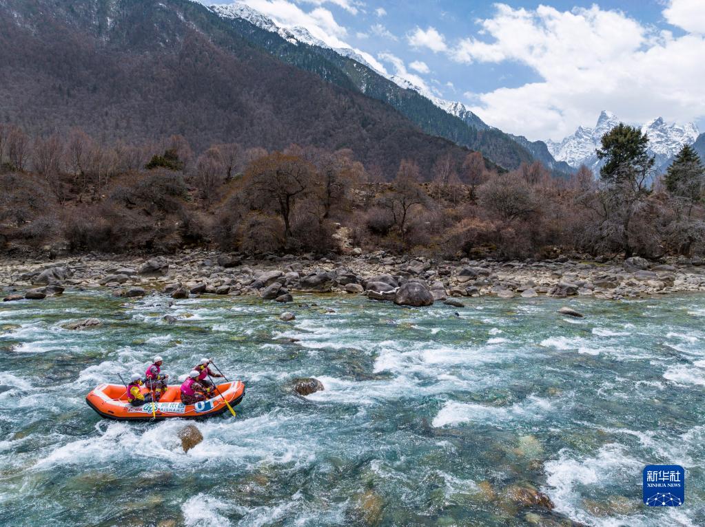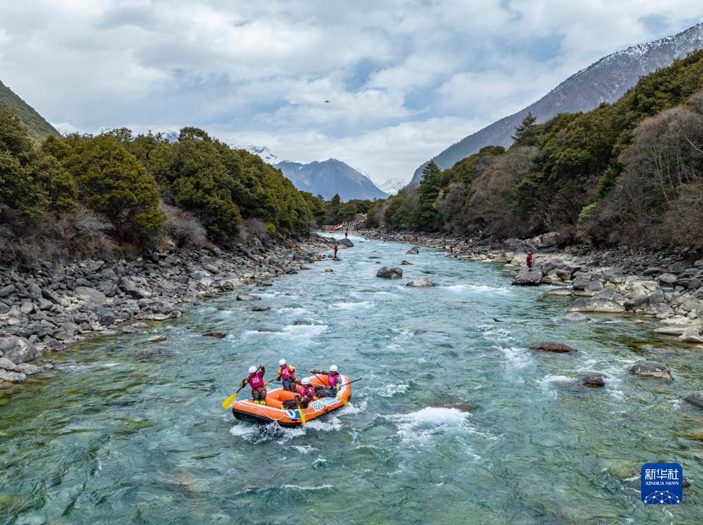 4月16日,“西藏旅游股份有限公司漂流隊”選手在激流漂流筏繞標賽中,他們最終獲得季軍(無人機照片)。新華社記者 孫非 攝